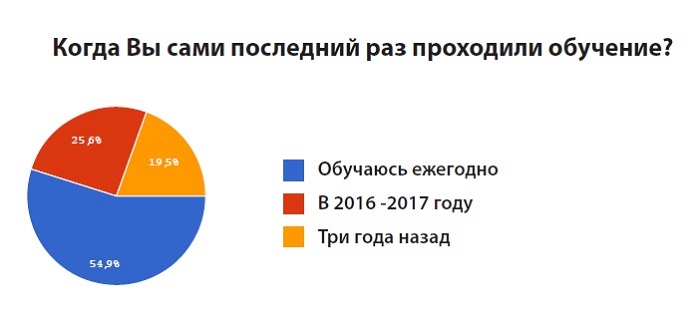 Итоги опроса показали, что большинство преподавателей (54,9%) ежегодно проходят специализированное обучение. При этом они предпочитают самообразование (62,7%), специализированные курсы (43,4%), работу с наставником (34,9%) и обучение в бизнес-школе (15,7%). Только 9,6% опрошенных заявили, что не получали специализированного образования.
