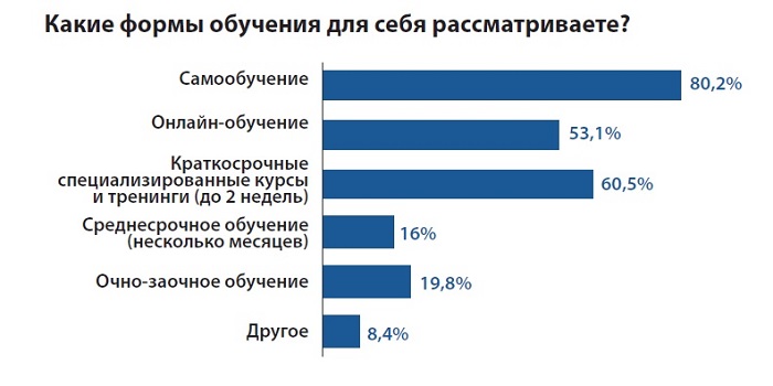 Приоритетные форматы обучения для них – это самообучение (80,2%), краткосрочные специализированные курсы и тренинги до 2 недель (60,5%) и онлайн-обучение (53,1%).