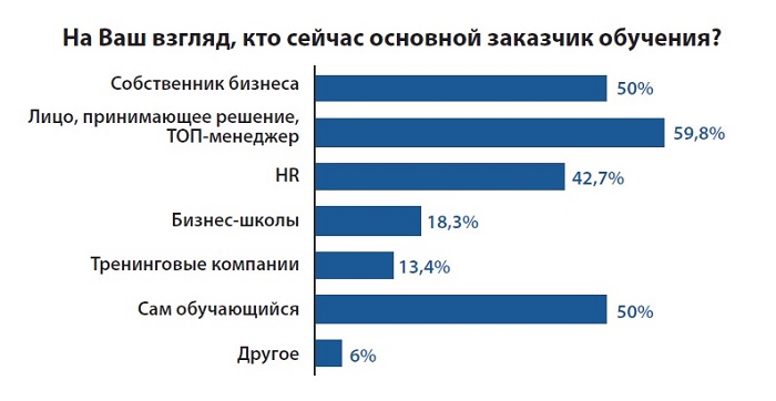 В рамках исследования задавались вопросы и по общему состоянию рынка бизнес-образования. По наблюдениям опрошенных, основными заказчиками обучения сейчас выступают топ-менеджеры компаний (59,8%), собственники бизнеса (50%), сами обучающиеся (50%) и HR-менеджеры (42,7%).